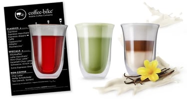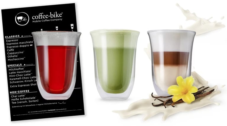 Neben absoluten klassischen Kaffee Getränken (z.B. Espresso oder Cappuccino) sind unsere Coffee-Bikes auch für ausgefallene Kreationen und hochwertige Non-Coffees bekannt. Serviert in zu 100 % biologisch abbaubaren Bechern oder edlem Porzellan überzeugen zum Beispiel unsere Heiße Schokolade und der Chai Latte Genussliebhaber am Bike geschmacklich schließlich ebenso wie koffeinhaltige Getränke, die passionierte Coffee-Shop Besucher bei uns sehr gerne trinken.