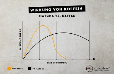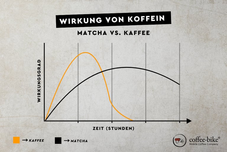 Diese Grafik zeigt den Unterschied in der Koffeinwirkung zwischen Matcha und Kaffee: Matcha Latte liefert eine gleichmäßigere und länger anhaltende Wirkung, während Kaffee schnell wach macht.